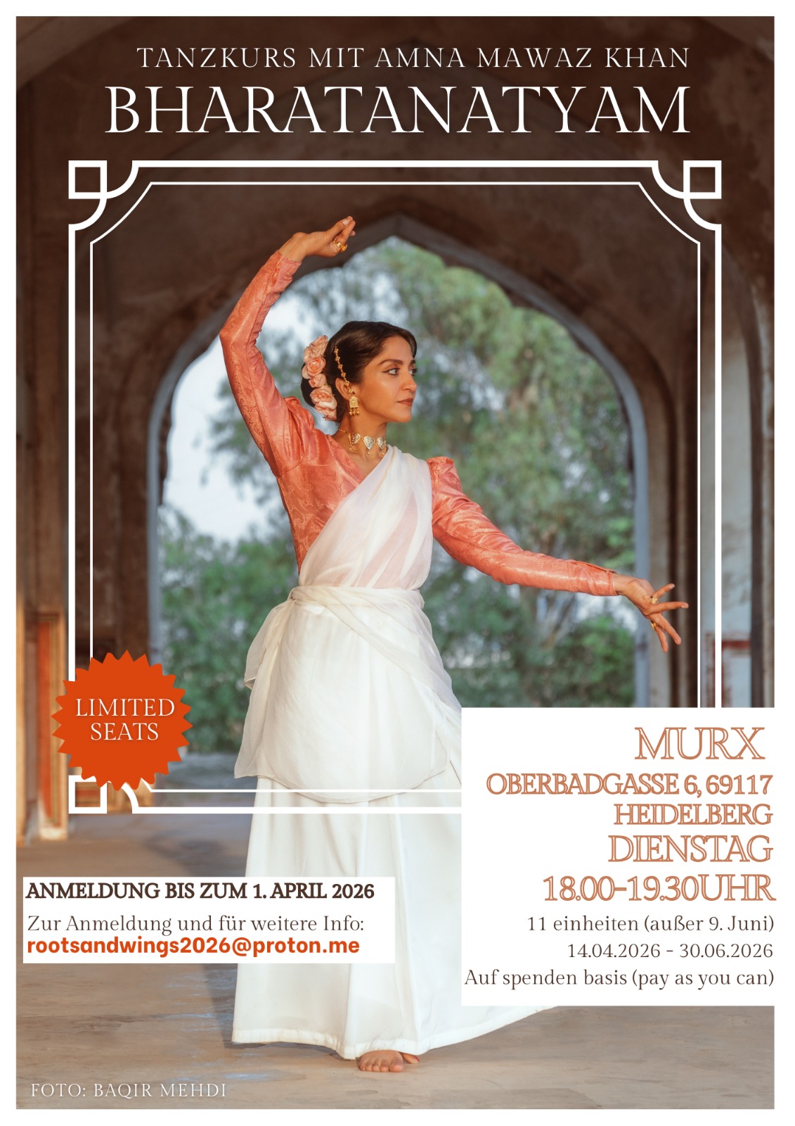 Explore the south Asian dance form Bharatanatyam with dance artist Amna, where body conditioning suited for the particular bodywork of the dance form will be focused on. Along this, participants will learn a classical choreography.