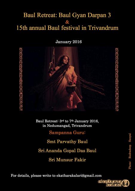 As we get many requests for learning and understanding the Baul tradition , we are organizing our third Baul retreat with eminent Baul practitioners from 3rd till 7th January 2016, at Nedumangad, Trivandrum. We are taking only limited number of participants, if you are interested please write early to ekatharakalari@gmail.com