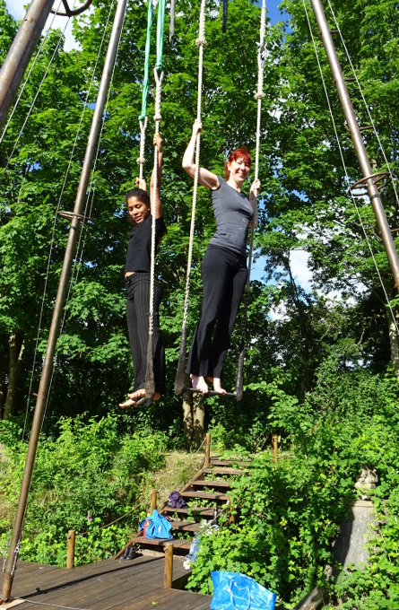 There were two other personal highlights for me in this festival. One was early morning trapeze training on Jana's trapeze, which was set up outside at the edge of the theatre's lawn. This took me to the limits of my physical ability; how is it that as a child I could effortlessly swing myself up onto the playground bars and spin around without any problem, but now I can't even get my legs up without help? Admittedly the bar is higher up, and I'm a lot heavier than when I was 10 years old. With a bit of help from Jana I got there, and once up it was a great sense of accomplishment to sit, stand and do some very modest moves. To be continued, I hope!