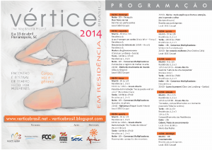 Vértice Brasil en Residencia es una versión especial de las reuniones / festivales que hemos estado promoviendo cada dos años. Este año, nos reuniremos 60 artistas por una semana con el fin de investigar los procesos creativos relacionados con los temas del cuerpo, la voz y Género. Los talleres se llevarán a cabo por Clara Lee Lundberg (Suecia) , Linda Wise ( Francia) , y Ana Cristina Colla , Raquel Scotti Hirson , y Naomi Silman (Brasil), que son actrices de LUME . Además de las residencias con estos artistas, vamos a tener muchas oportunidades para reuniones, discusiones y el intercambio relacionados con cuestiones como el género, la inscripción y la documentación, la potenciación de los colectivos , y actuaciones. La residencia tendrá una duración total de 36 horas distribuidas en seis días a seis horas de trabajo por día. Al final del evento, habrán presentaciones, demostraciones de trabajo, y el procesamiento de lo que se aprendió en la forma de intercambio entre los participantes y la comunidad.